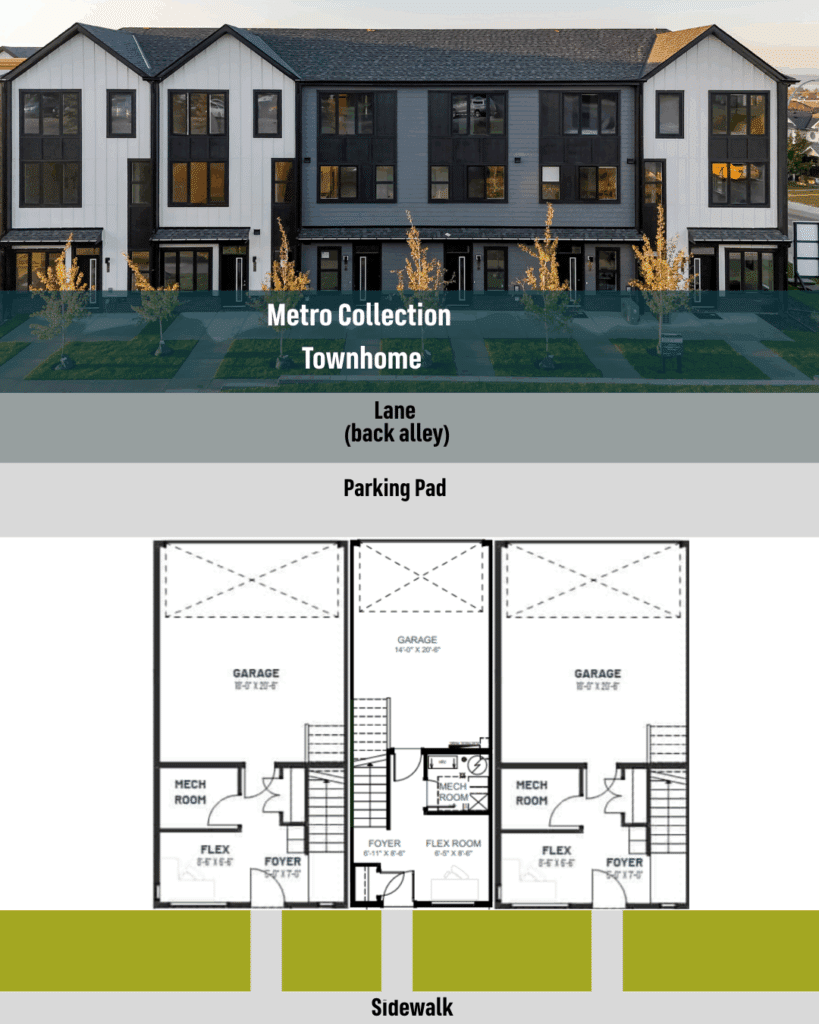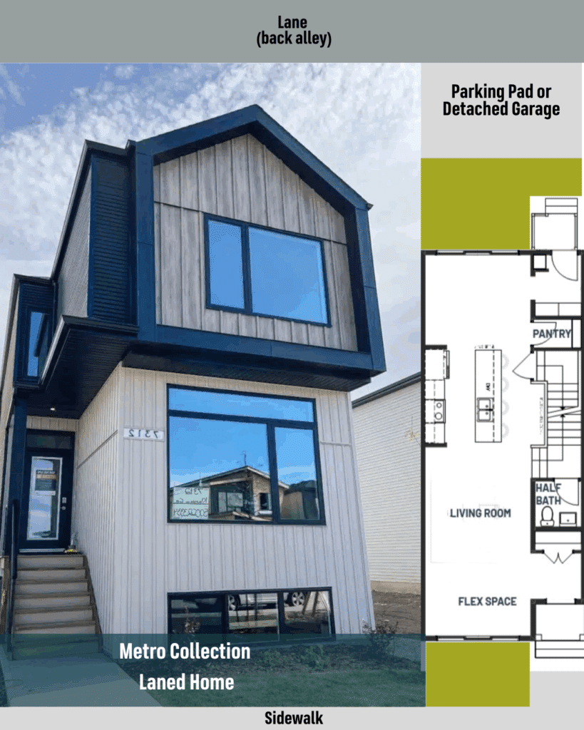 Available in our Metro Collection Rear Lane Single Family Homes, a traditional laned home setup includes a separate concrete parking pad or detached garage accessed from the back lane, offering enhanced privacy and personalization potential.