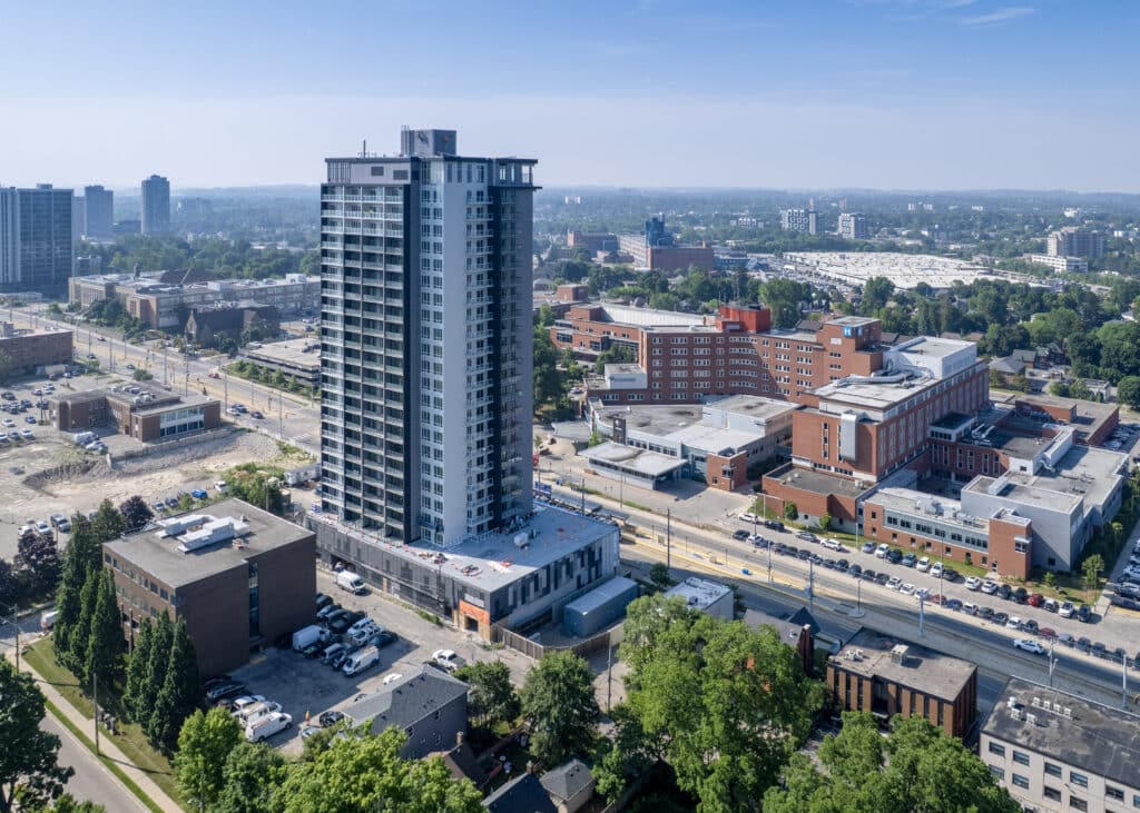 Located at the intersection of King Street and Pine Street in Kitchener, Ontario. This transit-oriented, mixed-use tower consists of: